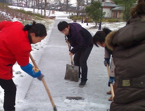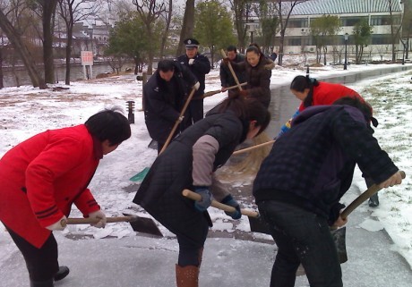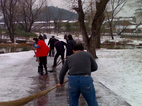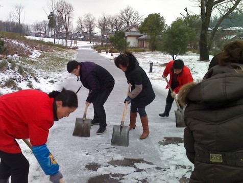 雖然每當(dāng)大雪覆蓋,公司也有嚴(yán)明的經(jīng)律,各管理處必須第一時(shí)間將所在管理處的門前和通道清理干凈,各管理處還是在完成好自己職責(zé)的情況下抽調(diào)精兵強(qiáng)將,保證重點(diǎn)、全力以赴。公司在短短的2 個(gè)小時(shí)時(shí)間里調(diào)集23名員工,下午1點(diǎn)及時(shí)趕赴采石風(fēng)景區(qū)翠螺灣。在細(xì)雨薄霧中,經(jīng)過(guò)4 個(gè)小時(shí)的緊張戰(zhàn)斗,3000多米的游道終于掀起神秘的面紗,一條清晰的道路展現(xiàn)出來(lái)!受到風(fēng)景區(qū)領(lǐng)導(dǎo)的一致好評(píng)!