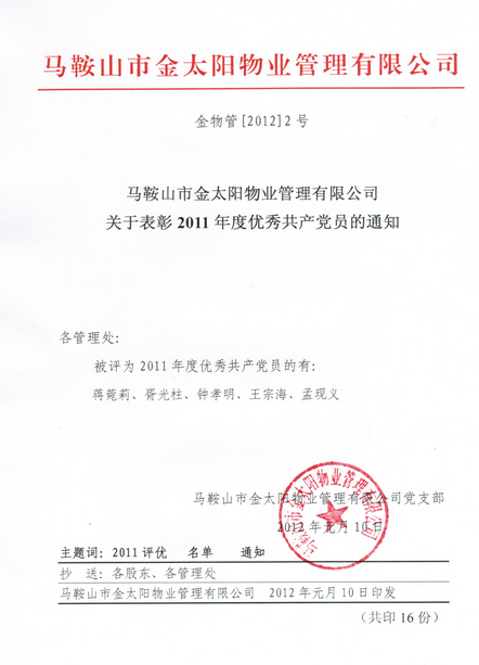 金太陽物業(yè)公司表彰2011年度優(yōu)秀黨員通知
