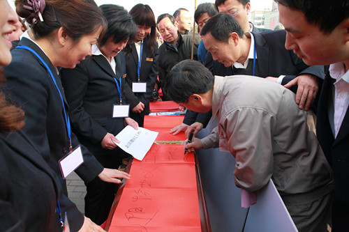 3月3日上午,“當(dāng)代雷鋒”郭明義來到馬鞍山,為郭明義愛心團(tuán)隊(duì)馬鞍山分隊(duì)授旗。盡管行程很緊湊,但郭明義還是給金太陽物業(yè)公司義工社題字,并與董事長(zhǎng)朱曉梅親切交談,表示應(yīng)當(dāng)將“當(dāng)代雷鋒”精神在鋼城繼續(xù),在金太陽物業(yè)公司義工社繼續(xù)。