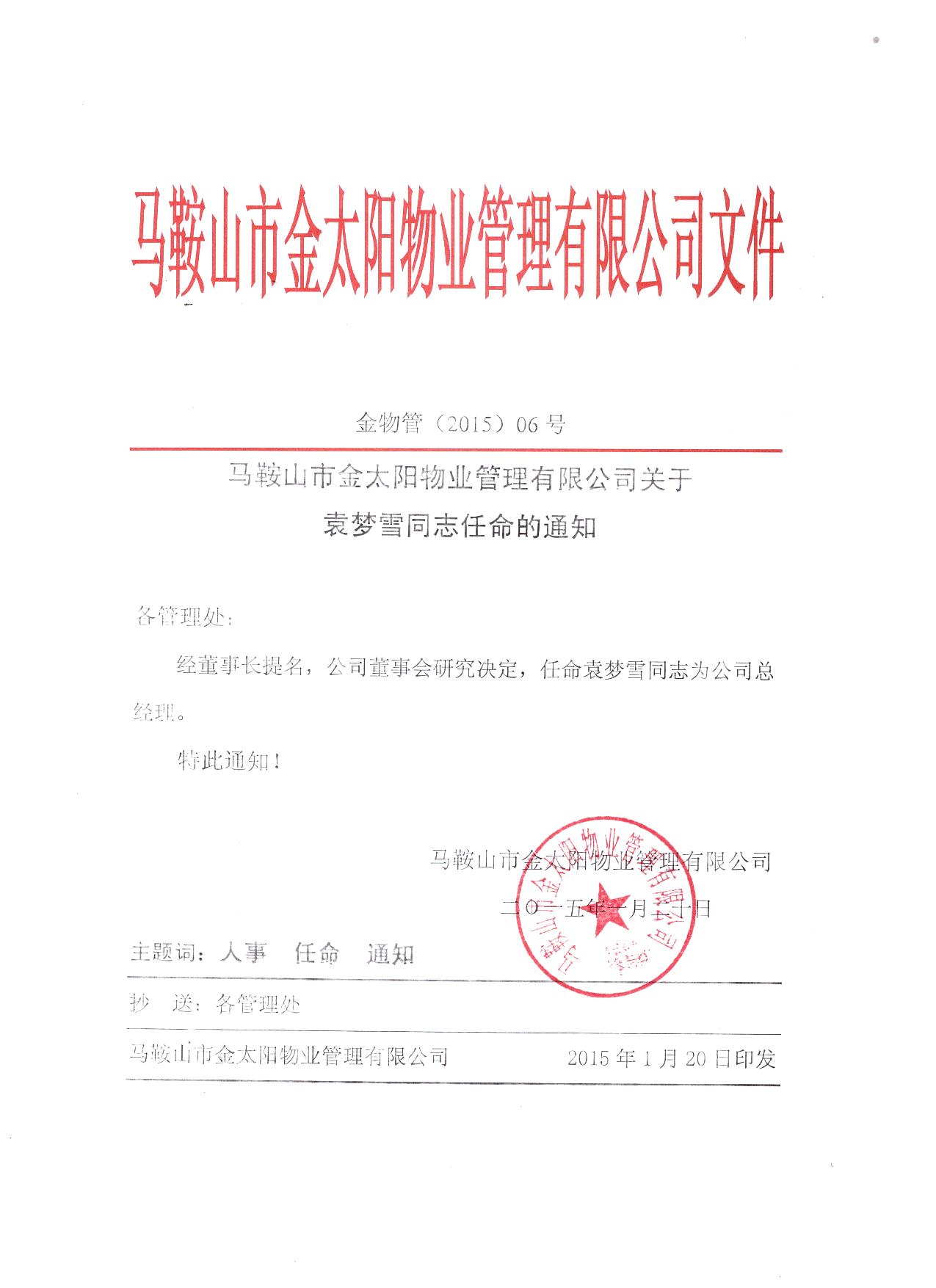 2015年1月21日,公司召開高層管理人員會議,公司董事長朱曉梅同志宣布袁夢雪總經(jīng)理正式上任。