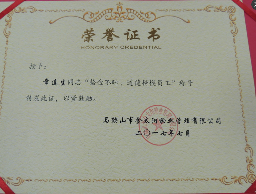 在短短兩個月的時間里,我公司接連發(fā)生兩起數(shù)額較大的拾金不昧好人好事。為社會真能量傳播舔磚加瓦,弘揚了金太陽人精神。作為物業(yè)公司員工的章連生、趙作萍,她們平時的工資不高,收入也不大,但她們在金錢面前表現(xiàn)出來非已之財秋毫莫取的品格和精神令人欽佩,使人感動。這是一種高尚的品格,這是一種博大的精神。她們的行為再次向社會證實,金太陽物業(yè)公司,業(yè)務雖小,但好人不少;業(yè)務不大,但金太陽精神始終在教育和感染每一位同志。