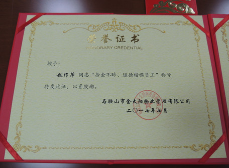 馬鞍山市金太陽物業(yè)管理有限公司于7月8日上午在公司會議室舉辦了“拾金不昧”表彰大會。公司管理人員及員工代表參加了本次會議。本次大會表彰了我公司員工章連生、趙作萍拾金不昧的感人事跡。并就弘揚社會正能量,弘揚金太陽精神進行了座談。