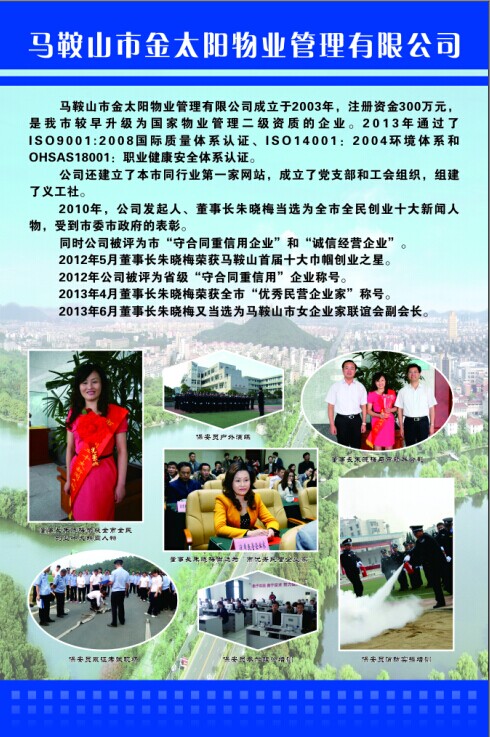 作為市樓宇物管的領航者,金太陽物業(yè)公司在保安正規(guī)化建設的道路上從未止步并屢獲佳績。今年九月,我公司當選為馬鞍山市保安協會副會長級單位,這既是相…